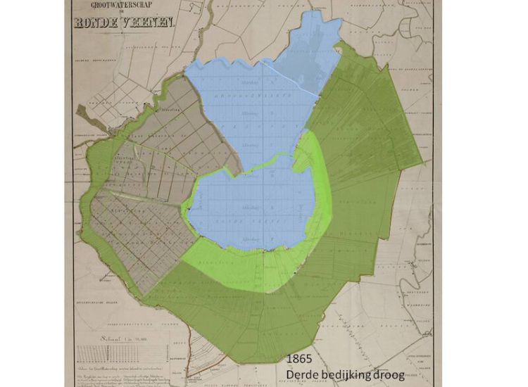 Pas in 1789 bekrachtigden de Staten van Utrecht een octroy om het gebied van de veldzijde van Mijdrecht, de grote Mijdrechtse poel, in te polderen. Na 1672 waren de kleine polders van de Ronde Venen gesaneerd en was een omdijkt gebied ontstaan met een gelijk peil. (zie ook: waterhuishouding 1000-1700) .Alle tussendijken waren geslecht, zo ontstond De Rondeveense Polder. In de eeuw daarna was er langzaam een samenwerking ontstaan waardoor het mogelijk werd om de verveende gebieden in te polderen zonder veel overlast voor het omliggende gebied. Er werd plan gemaakt om door de constructie van drie polders het gehele gebied van bijna 1800 ha droog te krijgen. De drie polders waren De Eerste, Tweede en Derde Bedijking. Het water uit de polders werd geloosd op de veenriviertjes,
